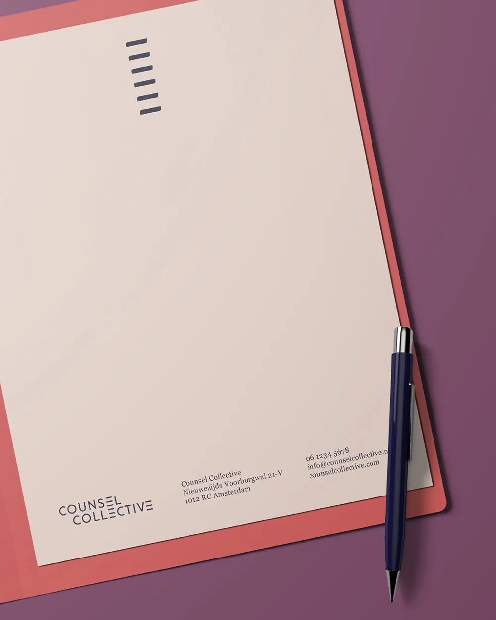 Het concept ‘on-juridisch goed’ staat centraal bij Counsel Collective. Het merk beweegt zich in een industrie waar alles draait om reputatie en imago, maar positioneert zich anders: naast ondernemers, niet alleen bij problemen, maar voor oplossingen. Om te laten zien dat het dezelfde taal spreekt, de uitdagingen begrijpt en betrouwbaar is, kreeg Counsel Collective een on-juridisch mooie visuele identiteit. Hiermee biedt het merk een modern tegengeluid in de vaak saaie papierwereld en kleine lettertjes van juridische dienstverlening en advocatuur, en toont het contrast tussen de formele juridische wereld en een creatieve, buiten-de-box denkende, frisse benadering. Dit contrast is letterlijk terug te zien in de vormgeving van deze nieuwe branding. In de designs verschijnen twee werelden, verbonden, en tegelijk gescheiden, door een stapel papierwerk (het beeldmerk). Dit project heb ik van begin tot eind, van conceptontwikkeling tot drukwerk, zelfstandig gerealiseerd.